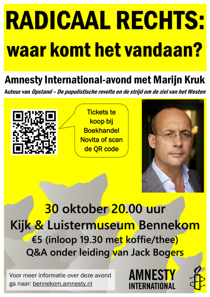 Op donderdag 30 oktober, een dag na de landelijke verkiezingen, organiseert de Werkgroep Bennekom van Amnesty International een avond over de opkomst van radicaal rechts in Europa. Marijn Kruk, journalist, columnist bij onder andere NRC en schrijver van het boek ‘Opstand – De populistische revolte en de strijd om de ziel van het Westen’, is gastspreker. Hij analyseert en duidt de opkomst en de ambities van populistische leiders en betrekt daarbij de actualiteit van de verkiezingsuitslag. Er is ruimte voor vragen en discussie onder leiding van Jack Bogers.